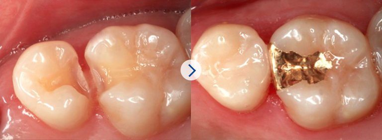 충전물은 주로 금, 레진, 질코니아 등의 재료를 이용하는데, 손실된 치아와 똑같은 모양으로 제작하여
